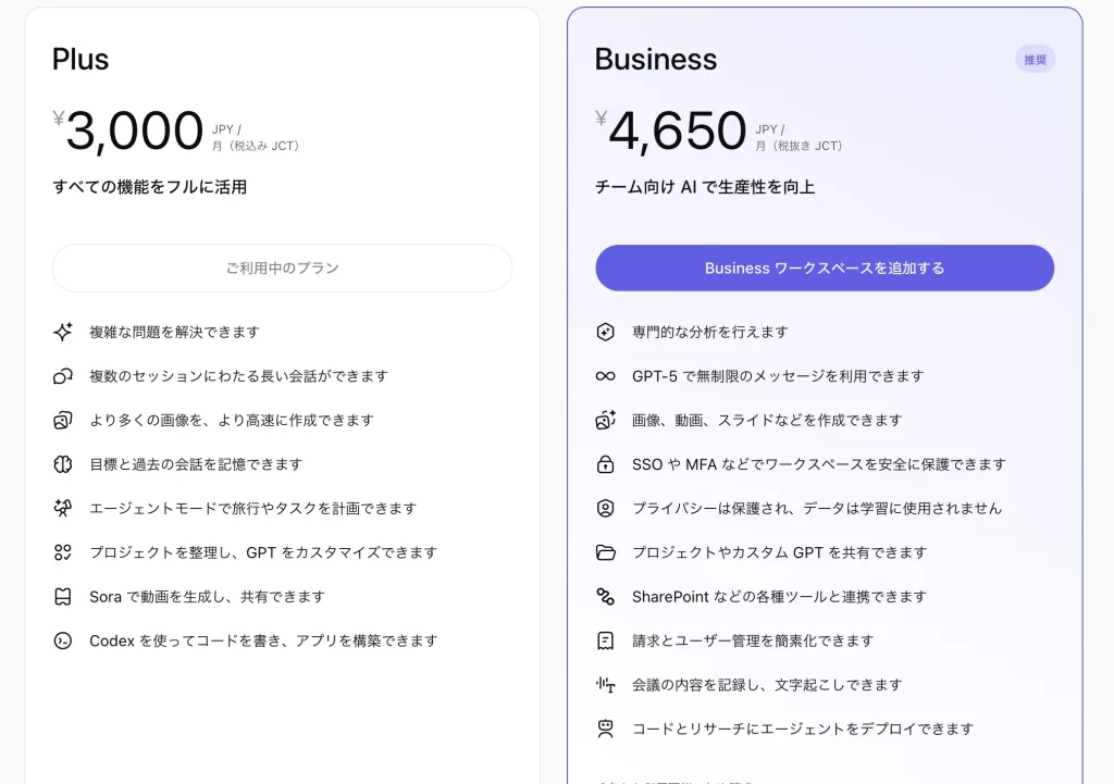 ChatGPT Plus と ChatGPT Business は、どちらが上位という関係ではなく、使う前提が異なるプランです。