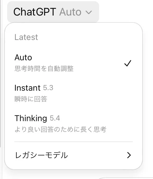 2026年3月現在、ChatGPTを立ち上げるとまず最初に出てくるのはGPT 5.3 InstantでもGPT 5.4 Thinkingでもありません。Autoです。