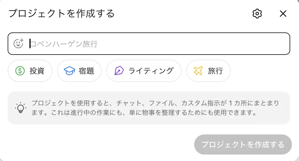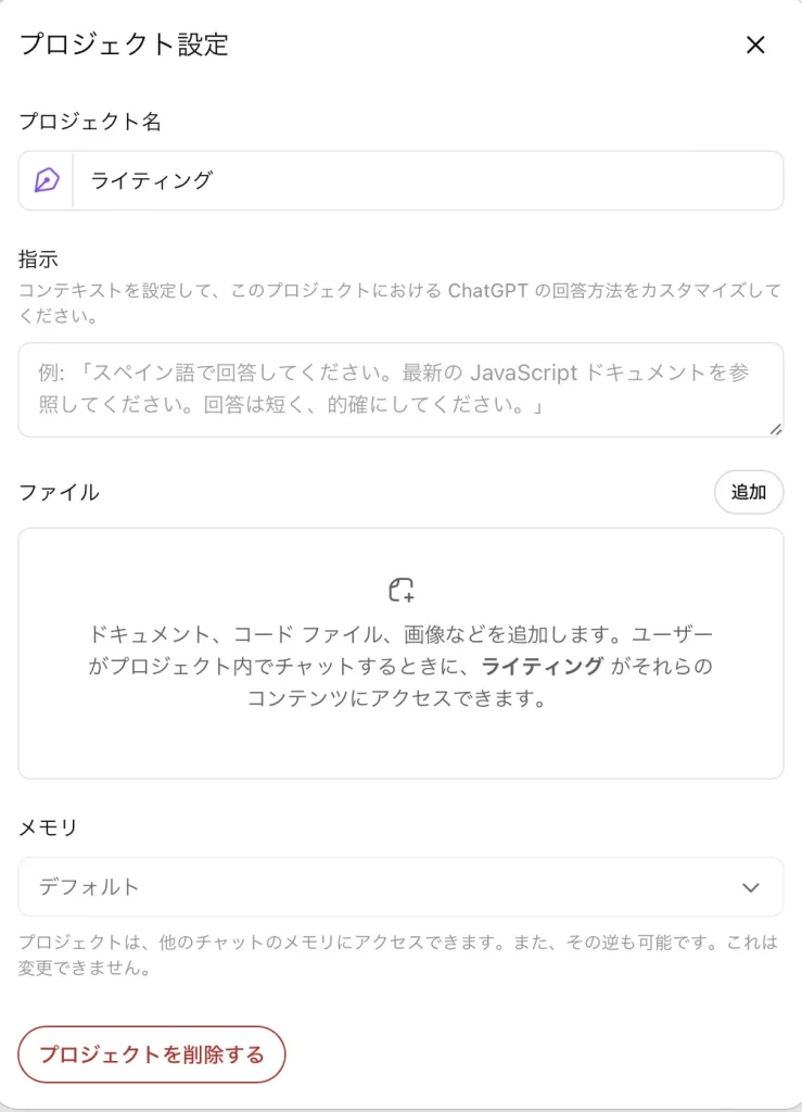 ChatGPTのプロジェクト機能とは、特定のテーマや業務ごとに、チャットのやり取り、指示内容、関連ファイルをひとまとめに管理できる機能です。