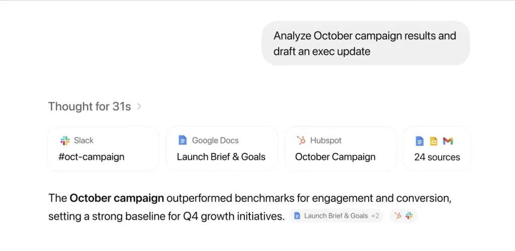 Slackの会話ログ、Googleドキュメントの議事録、HubSpotの顧客情報などを統合して、プロジェクト単位のレポートを自動生成することも可能です。現時点では、新しいチャットごとに手動で機能を有効化する必要がありますが、将来的にはブラウジング機能やチャート生成など、他のツールと統合された統一インターフェースに進化する予定とされています。