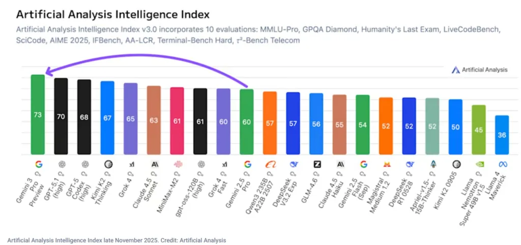 Google DeepMindの研究者が「クレイジーなほどの大差」と表現した通り、Gemini 3 Proが叩き出した数値は、現在のAI競争の勢力図を完全に塗り替えました。独立系AI評価機関であるArtificial Analysisのインデックスにおいて、Gemini 3 Proはスコア「73」を記録し、OpenAIやAnthropic、そして中国の有力スタートアップ群を抑えて「AIの新たなリーダー」に認定されました。
