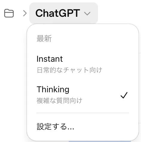 GPT-5.4の時代では、ChatGPTのAutoを選んでいた人も多かったでしょう。Autoは、軽い質問にはInstant、複雑な質問にはThinkingというように、ChatGPT側が自動で使い分けてくれていました。そのため、ユーザーはモデルを細かく意識しなくてもよかったのです。