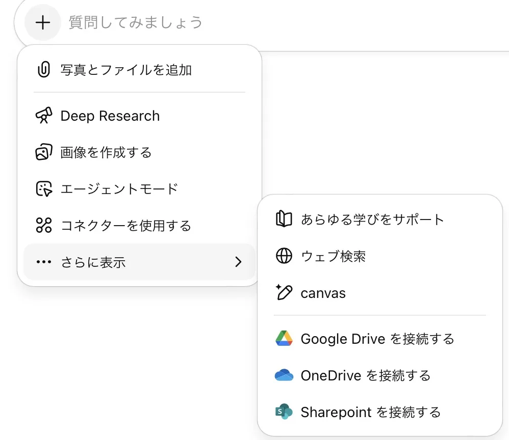 チャット入力欄の左のプラスマークから「・・・さらに表示」を選択。するとさらに多くの選択肢が出るので、「あらゆる学びをサポート」を選択します。