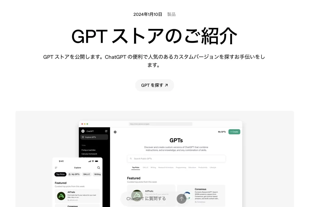 以前のGPTストアは「ChatGPTとは別のストアでカスタムGPTを探して使う」方式でした。今回のローンチは、アプリをチャットの回答そのものに組み込む方式です。
