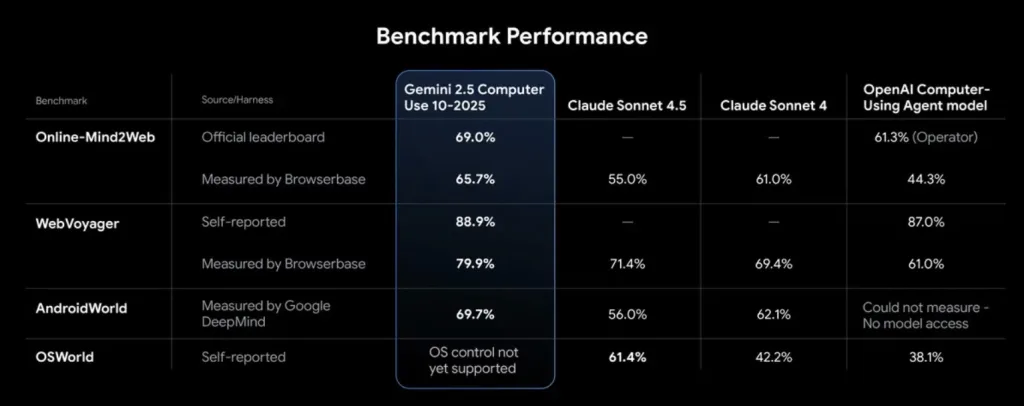 Googleによる検証では、Gemini 2.5 Computer Useは複数の操作系ベンチマークで高いスコアを記録しました。