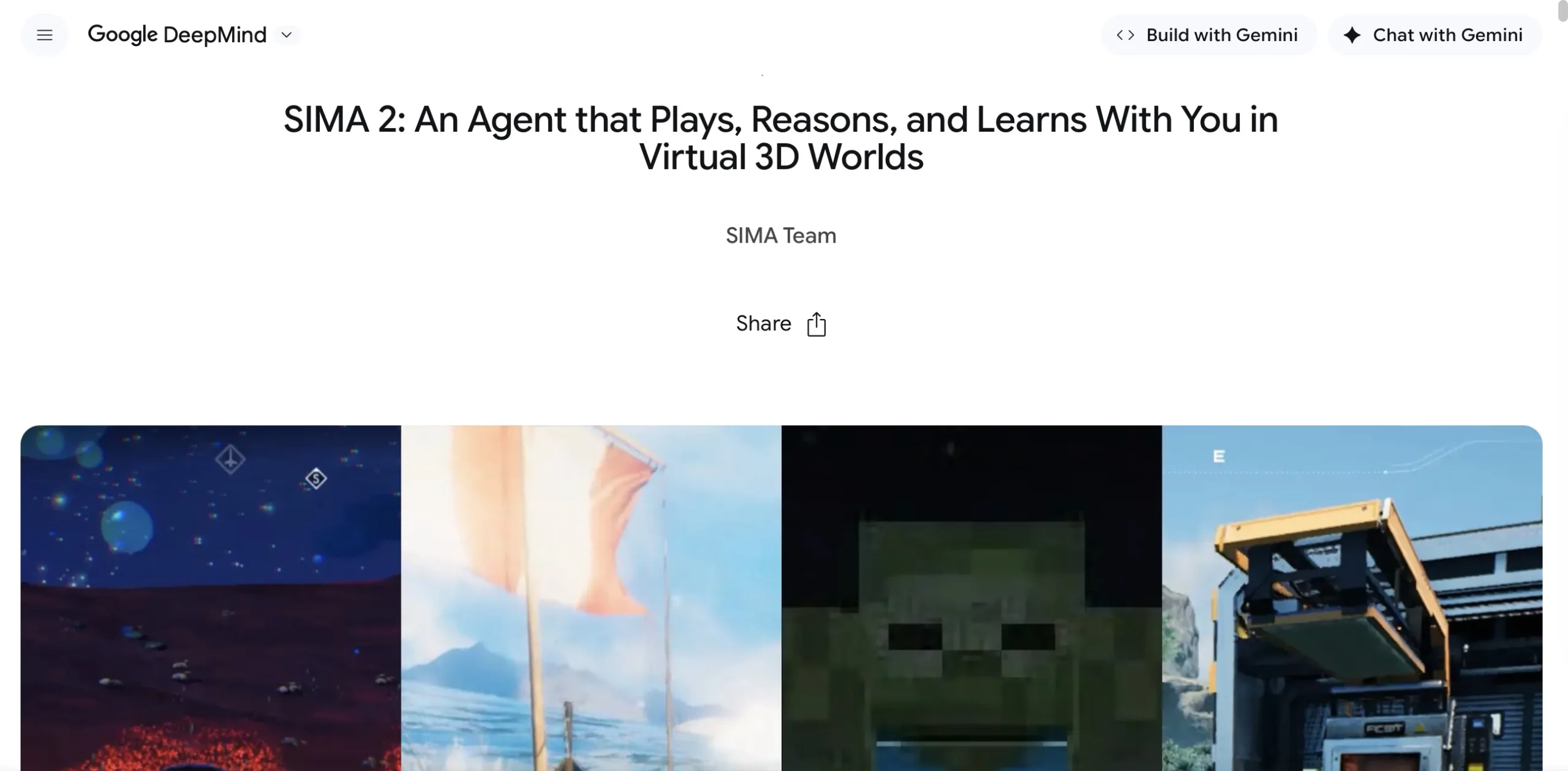 仮想環境で推論しながら行動するために設計されたエージェントです。SIMAは以前から研究されていたAI agentの基盤ですが、今回のSIMA 2ではGeminiの推論能力を統合し、複雑な環境理解とタスク遂行が可能になりました。